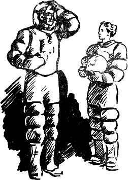 В шлюзовой каюте у выхода были заранее приготовлены биологические скафандры и «прыгающие скелеты» — стальные, обшитые кожей каркасы с электродвигателем, пружинами и амортизаторами для индивидуального передвижения при увеличенной силе тяжести, которые надевались поверх скафандров.
