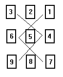 Верхний горизонтальный ряд (позиции 1-2-3) соответствуют предыдущему воплощению, средний (4-5-6) – нынешнему, а нижний (7-8-9) – будущему. Первые позиции (1, 4, 7, правый вертикальный ряд) характеризуют начало жизни, вторые (2, 5, 8, средний вертикальный ряд) – середину, третьи (3, 6, 9, левый вертикальный ряд) – завершение (в настоящем воплощении – то, что осталось).