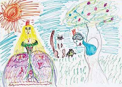 Тогда прекрасная принцесса заплакала, подхватила свое пышное-пышное платье и понеслась из леса. Неслась она, неслась, а навстречу ей старушка с ведром. «Ты кто?» — спрашивает. «Прекрасная принцесса с пятью ногами», — ответила принцесса, поворачивая к старушке свою зеленую пасть. «А почему у тебя зеленая пасть?» — спросила старушка. «Не знаю, разве вам не нравится?» — спросила принцесса. «Нравится, — сказала старушка, — только у принцесс не бывает такой пасти».
