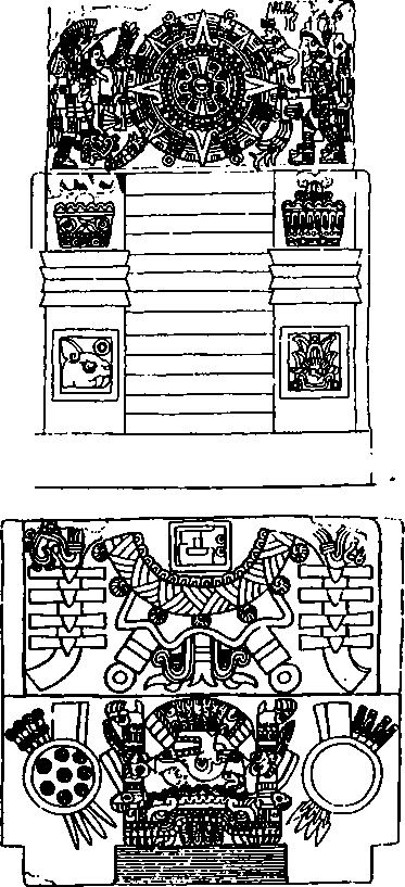 Более ранние скульптуры относятся к началу правления Монтесумы и к 1507 году. Для других главных работ, осуществленных при нем, точная датировка, к сожалению, отсутствует. Так обстоит дело и с другим ацтекским шедевром — знаменитым Камнем Солнц, называемым также Ацтекским календарем. Это громадный диск диаметром 356 см и высотой около пятнадцати сантиметров полностью заполнен рельефами на главной и боковой поверхностях.