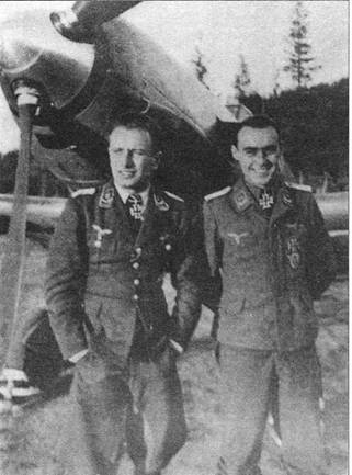 Командир эскадрильи оберлейтенант Хорст Карганико и командир звена оберфельдфебель Хуго Дамер (Obfw Hugo Damer). Первые лётчики-истребители, ставшие кавалерами РК на Полярном фронте. Известно, что Карганико летал на Bf 109Е-3. Крышка на коке от Е-7.