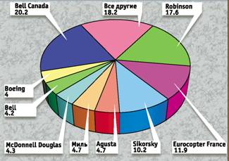 В вертолетной индустрии продолжаются перемены. Boeing согласилась продать линии производства вертолетов MD-500, MD-600N, MD Explorer, прежде производящихся фирмой McDonnell Douglas, компании MD Helicopter Holding Inc, дочернему предприятию базирующейся в Европе компании RDM Holding Inc. Правда, сделка еще должна быть одобрена Федеральной торговой палатой США, поэтому на секторной диаграмме доля фирмы Boeing на рынке представлена с учетом прогноза производства этих летательных аппаратов.