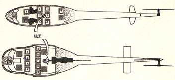 В салоне вертолета Миль расположил пассажиров по трое спиной друг к другу. Седьмой пассажир находился рядом с пилотом, а восьмой у задней стенки. Конструктор «развил» пол в средней части фюзеляжа – был образован кессон, который одновременно служил опорой для шасси, контейнером мягкого бака для топлива и сиденьем для пассажиров. При такой компоновке центровка в любом варианте загрузки практически не изменяется от начала и до конца полета. Размещение пассажиров в салоне вертолета того же класса, что и В-2 – Bell-Iroquois, было иным. На рис. 1 представлены схемы размещения пассажиров в салонах этих вертолетов.