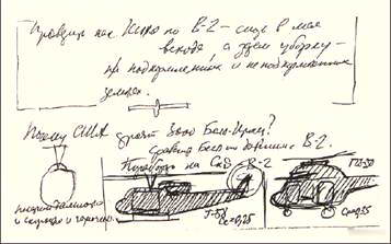 Создавая В-2, М.Л. Миль работает над улучшением аэродинамического сопротивления фюзеляжа и винта, так как за аэродинамическое несовершенство конструкции, писал он, мы «платим дальностью, и скоростью, и горючим». И он снова рисует в дневнике два вертолета рядом – свой и американский Bell-Iroguois, сравнивая их теперь уже по этому параметру (рис.2).