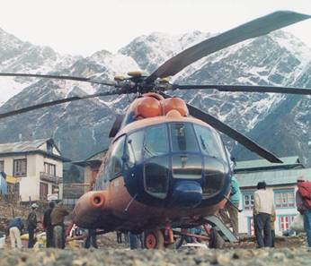 Наш вертолет в Лукле – небольшом поселке, перевалочной базе для альпинистов, следующих до самой высокогорной гостиницы в Самбочи (4 тыс. м над уровнем моря). Командир вертолета – Сергей Владимирович Лопатин, прекрасный пилот и мой большой друг