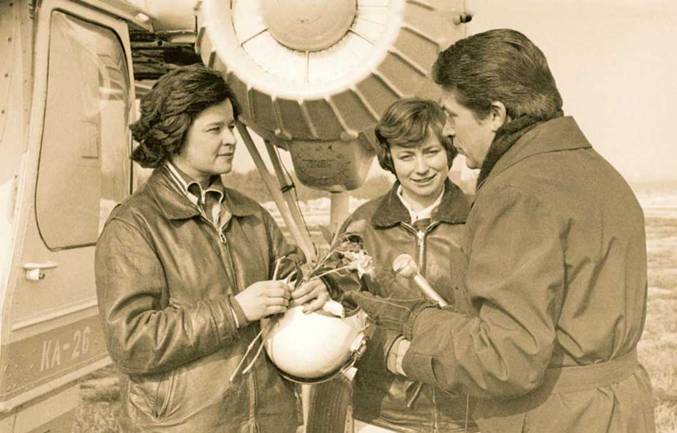 T. Зуева, Н. Еремина дают интервью для программы «Время» после установления рекордов на Ка-26, 1982 г.