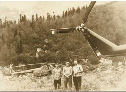 Посадка Ми-8 в горах. На снимке слева направо: В.Б. Карташев, Б.Я. Демчак и В.М. Белянин. Гора Фишт
