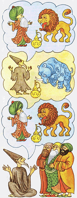 — Ах да! Значит, если дервиш, то про муллу, а если мулла, то про дервиша. Ловко! Мулла расскажет льву про дервиша, ифрита и носорога, и в этойсказке дервиш уже будет морочить голову носорогу про муллу, джинна и льва. Ну и чем же кончится дело?