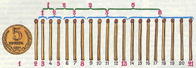 — Да, но смотри, ты уже решал эту задачу раньше. От 8 до 5 как раз 3 шага. А для трех предметов ты уже все знаешь: если он берет 1, ты — 2, а если он — 2, ты — 1. Ведь числа Фибоначчи устроены так, что интервалы между соседними числами тоже являются числами Фибоначчи. Ты пытаешься посадить противника на ближайшее число Фибоначчи, а если не можешь, то прибавляешь к этому числу позапрошлое число Фибоначчи. Скажем, от 21 ты должен сажать противника на 13, но этого ты сделать не можешь, значит, прибавляешь к 13 позапрошлое число, то есть 5 (13 + 5 = 18), и стремишься дать противнику число 18. Это просто, так как от 18 до 21 как раз 3 шага — снова число Фибоначчи. Заставил его взять 18 — и тебе осталось 5 шагов до 13, а как проходить 5 шагов, ты тоже знаешь. Вот и все!