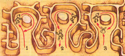 — Алгоритм очень прост, называется «Правило правой руки». Смотри: я кладу мой узелок и иду вперед вдоль правой стены. Как только встречаю развилку, поворачиваю направо. При таком алгоритме я не могу зациклиться — начать ходить по кругу, потому что, если бы я начал ходить по кругу, это бы говорило о том, что я выбирал все время не самый правый коридор. — И Мальчик с пальчик начертил на песке такой рисунок (рис. 1). — Поэтому правильный обход дал бы следующий результат (рис. 2)».