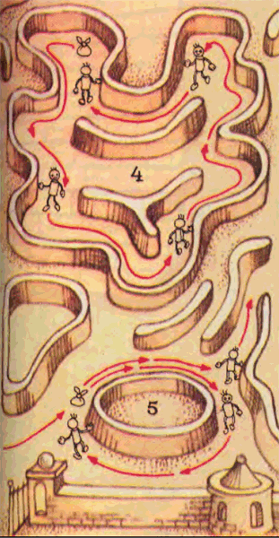 — Ты невнимательно слушал. Мальчик с пальчик ясно сказал: «Кладу мой узелок». Ведь если у лабиринта нет выхода, алгоритм тоже не приведет к успеху, поэтому он и уточнил: «Раз я сюда пришел, то хоть один выход есть» (рис. 4). Поэтому, наткнувшись на свой узелок, он поступит следующим образом: возьмет его, у ближайшей развилки выберет не самый правый, а второй справа коридор (рис. 5), ведь из развилки может быть много выходов, и повторит тот же алгоритм: положит узелок, пойдет вдоль правой стенки и так далее. Можно доказать, что если выход есть, то мы его обязательно найдем. А теперь попробуй написать программу выхода из лабиринта.