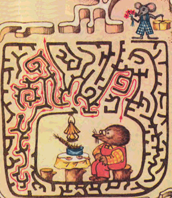 — Хорошо, — сказал Чип, — а теперь давай попробуем применить твою программу. Вот в журнале «Веселые картинки» напечатан лабиринт. Давай поищем путь от крота к мышке.