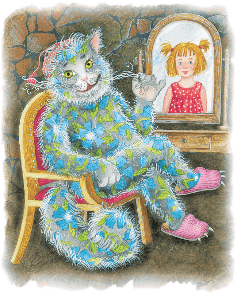 Кот был большой, чуть не с Таську ростом. По гладкой шерсти его были нарисованы крупные голубые цветы с бутонами, зелёными стеблями и листьями. На голове расшитая тюбетейка, на лапах тапочки с когтями. Он сидел в кресле, спиной к Таське. Перед ним стояло большое зеркало. Кот смотрелся в него и заплетал в косички усы.