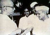 А.Ч. Бхактиведанта Свами и премьер-министр Индии Лал Бахадур Шастри у здания парламента в Нью-Дели в июне 1964 года