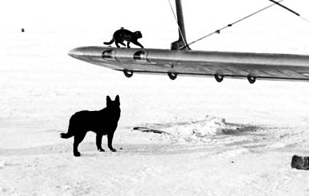 От собак Кузя спасается на крыле самолета, деревьев-то нет.