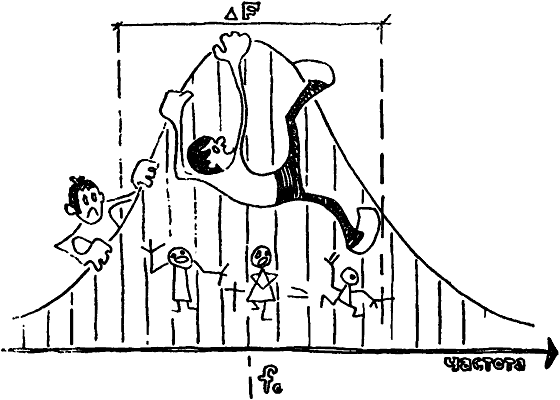 Снова обратимся к синусоидальному колебанию. Во времени оно извивается по плавной гармонической кривой. Его спектр — простейший из возможных — одна-единственная вертикальная линия на оси частот (ее высота пропорциональна амплитуде колебания).