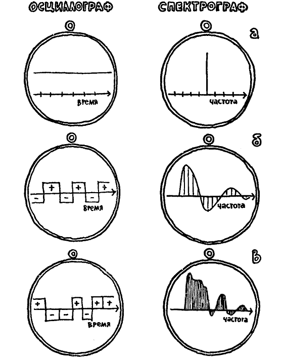 Тогда — о радость! — на выходе приемника появляется долгожданная золотая рыбка. Но радоваться рано. Ее будут усиленно маскировать целые стаи рыб других неразумных пород (внешние и внутренние помехи различного рода). Как узнать среди них нашу золотую? Для этого надо одновременно вести визуальное наблюдение за обеими сторонами медали: формой сигнала во времени и формой его спектра. Первое выполняется подключением на выход приемника осциллографа, второе — спектрографа.