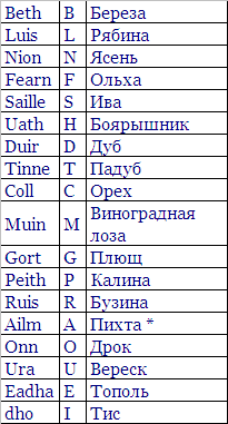 В первый раз я увидел "Beth-Luis-Nion" — алфавит деревьев в "Ogigia" Родерика O'Флаерти. Он напечатал его вместе с "Boibel-Loth"-алфавитом как уникальную реликвию культуры друидов, передаваемую устно от поколения к поколению в течение многих веков. Говорят, в более поздние времена им пользовались только для прорицаний. Состоит он из пяти гласных букв и тринадцати согласных. Каждая буква названа каким-нибудь деревом или кустом: