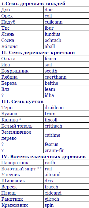 Доктора Макалистера нельзя упрекнуть за то, что он сомневается в древности "Beth-Luis-Nion"-алфавита O'Флаерти, поскольку несколько различных систем классификации деревьев существовало в средневековой Ирландии. Например, согласно "Irish Brehon Law" (IV. 147), деревья делятся на четыре категории по тому наказанию, которое полагается за их незаконную вырубку, и строгость наказания уменьшается от первой к четвертой категории: