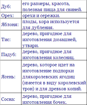 Победа Гвидионова ясеня над ольхой Брана в Cad Goddeu нечаянно проявилась и тут: ясень, который первоначально не входил в группу священных деревьев, теперь единственный упоминается в связи с королем, а ольха низведена до крестьянского статуса. Утилитарное объяснение "благородства" в комментарии знаменует большие религиозные перемены, а когда относительная ценность деревьев выражается в штрафных терминах, нечего и говорить о священном значении рощи, да и поэзия тоже приходит в упадок. Однако в те времена, когда этот закон был в силе, ученики поэтов зубрили наизусть древний катехизис, записанный в "Ученых слушаниях", где есть еще одна классификация деревьев: