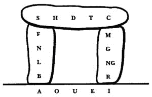 Ключ к этому алфавиту отыскался в упоминании Амергином дольмена. Это — алфавит, который лучше всего объясняяется, когда он построен в виде дольмена из согласных с порогом из гласных. Дольмены напрямую связаны с календарем в легенде о бегстве Граине и Диармойда от Финна Мак Коола. Бегство продолжалось один год и один день, и любовники каждую ночь останавливались возле нового дольмена. Бесчисленные "ложа Диармойда и Граине" есть в Корке, Керри, Лимерике, Типперэри и на западе, и каждое из них отмечено дольменом. Таким образом, этот алфавит-дольмен послужит и как календарь с одним столбом для весны, другим — для осени, перемычкой — для лета и порогом — для Новогоднего дня. Итак: