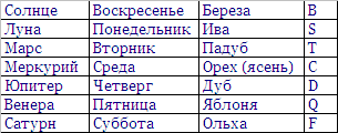 Семь священных деревьев ирландской рощи, как мы уже говорили, — береза, ива, падуб, орех, дуб, яблоня, ольха. И все семь составляют неделю, поскольку ольху мы уже и так приписывали Сатурну (Брану), яблоню — богине любви Афродите, или Фрейе, дуб — громовержцу Юпитеру или Тору, иву — Луне (Цирцее или Гекате), падуб — краснолицему богу войны Марсу, а береза, естественно, начинает неделю, как она начинает солнечный год [143] . Деревом среды, посвященным богу красноречия, мог бы, естественно, стать ясень, но у древних ирландцев деревом красноречия и мудрости был орех, а не ясень, так как белгский бог Один, или Воден пришел в Ирландию поздно. Посмотрим на семь деревьев с их планетами, днями недели и буквами:
