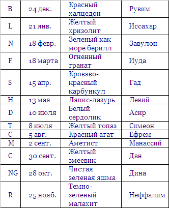 Что касается лишнего дня — 23 декабря, который отдан Вениамину, "Сыну моей правой руки", то есть "Правителю юга" (поскольку солнце достигает своей крайней южной точки в середине зимы), то ему принадлежит янтарь, который, по словам Иезекииля, цвета верхней части тела Иеговы, а нижняя часть у него — огненный гранат. Дерево Вениамина, uccon, или дикий каперсник, который покрывает зеленью стены и был первым деревом славы у иудеев, или святой loranthus, живущий за счет тамариска в пустыне.