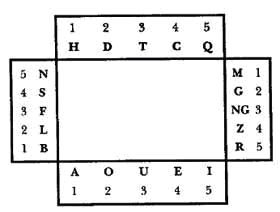 Гласные представляют пять лишних дней, вход в год, а перемычка и два столба — каждый соответствуют 120 дням. Однако Q и Z не имеют собственных месяцев в "Beth-Luis-Nion"-алфавите, и их появление в качестве двадцатичетырехдневных периодов во второй части "Boibel-Loth"-года делает "Tinne", а не "Duir", как в "Beth-Luis-Nion", центральной или главной буквой. Тина, или Танус, становится главным богом, как в Этрурии и друидической Галлии. И эти данные нетрудно теперь перевести на круг: