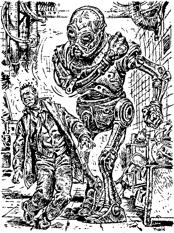 Из своего летающего склепа я смотрел, как молодой ученый вынул черный сгусток мозга из прозрачной емкости, в которой его вырастили, и поместил в черепную коробку огромного металлического тела — уродливого подобия человеческого. Внезапно механический монстр ожил и медленно двинулся на своего создателя, сверля его взглядом сверкающих голубых линз.