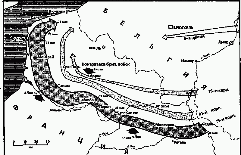 Когда войска Гудериана выдвинулись к Буа-Мон-Дье, он увидел, что между этими высотами и Маасом открывалась брешь шириной в двенадцать миль, в которую мог пройти весь его корпус и затем, повернув направо, устремиться к проливу. Настораживал лишь один фактор – сообщение воздушной разведки о концентрации французских танков против открытого фланга. Справедливости ради нужно заметить, что Гудериан посчитал необходимым спросить у командира 1-й танковой дивизии, готов ли тот ввести в этот разрыв всю свою дивизию, или же следует оставить фланговое охранение. От майора Венка, начальника оперативного отдела штаба дивизии, пришел ответ «Klotzen, nicht Kleckern» – «Бить кулаком, а не растопыренной пятерней». Как бы там ни было, но оба фланга 1-й танковой были надежно прикрыты. Справа 41-й корпус наконец-то форсировал Маас у Монферме и начал наступать на запад. Танки 2-й танковой дивизии двигались сбоку достаточно близко. Авиация союзников подвергла мосты ожесточенным налетам, но не смогла их разрушить. Слева «Великая Германия» и 10-я танковая дивизия приняли на себя удар 21-го французского корпуса. Особенно жаркие бои разгорелись вблизи деревни Стене, имевшей ключевое значение. Здесь в течение второй половины 14 мая и весь день 15 мая сражались подразделения 3-й французской бронетанковой дивизии и полка «Великая Германия». Французы попытались занять выдвинутые вперед оборонительные позиции, но потеряли много танков и отступили.