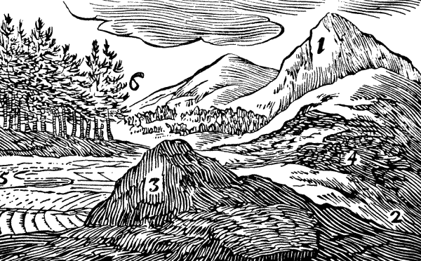 На земле находятся высокие горы (1), глубокие долины (2), возвышенные холмы (3), пустые пещеры (4), ровные поля (5), тенистые леса (6).