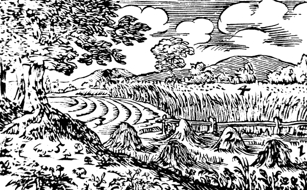 Сад ограждает труд человека (плотной) стеной (10), сложенной из камней (11), забором из кольев (12), досками (13), плетнем (14), сплетенным из кольев и хвороста; или же его ограждает природа кустарником и терновником (15).
