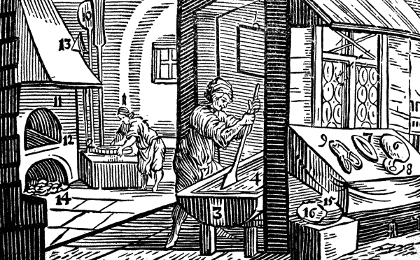 Пекарь просеивает муку через мучное сито (2) и насыпает ее в квашню (3); затем он подливает воды, делает тесто (4) и месит его деревянной скалкой (5); после этого делает хлебы (6), лепешки (7), сайки (8), крендели (9) и проч.
