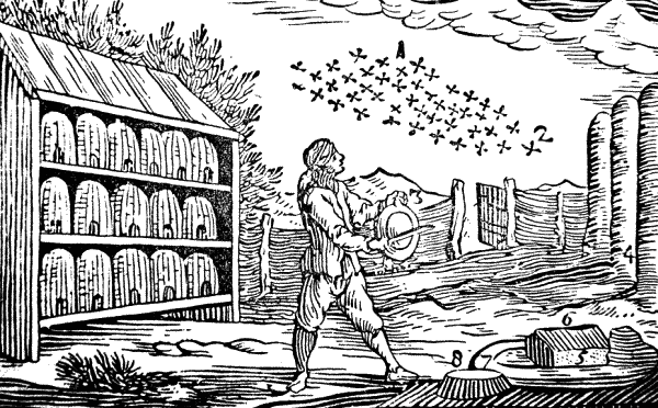 Пчелы образуют рой (1) и дают ему вождя (царя) (2). Когда этот рой собирается улететь, его отзывают назад звоном медного таза (3) и помещают в новом улье (4). Пчелы строят шестигранные ячейки (5), наполняют их медвяным соком цветов и делают соты (6), из которых течет мед (7). Ячейки, растопленные на огне, превращаются в воск (8).