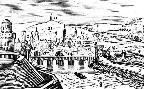 В город входят из пригорода (12) через ворота (13) по мосту (14).
