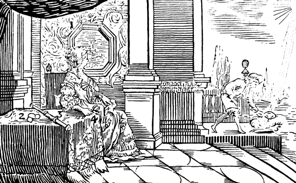 Потом кладет их на лопату (10) и сажает в печь (11) через печное отверствие (12); но раньше он выгребает кочергой (13) огонь и угли, которые он помещает под печью (14).
