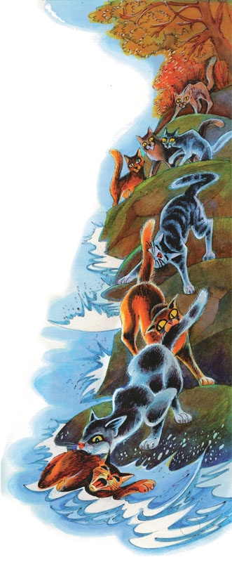 Но Мотылек уже не слышал его. Метнувшись в сторону, он пробежал мимо Малиновника и плюхнулся в воду. В тот же миг волна накрыла его с головой, и молодой воин скрылся в пучине, но, к счастью, вынырнул чуть ниже по течению и попытался вскарабкаться на камень. Было видно, как кончики его ушей отчаянно трясутся от напряжения.