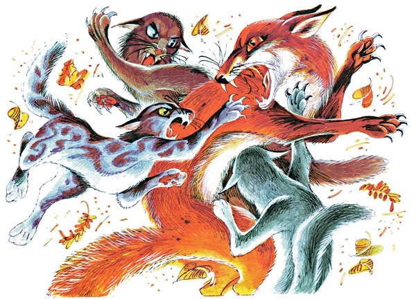 Орляк встал на задние лапы и изо всей силы прошелся передними лисице по ушам. Одновременно ловкий Хитроглазый, низко пригнувшись, поднырнул лисе под грудь и расцарапал ей морду.