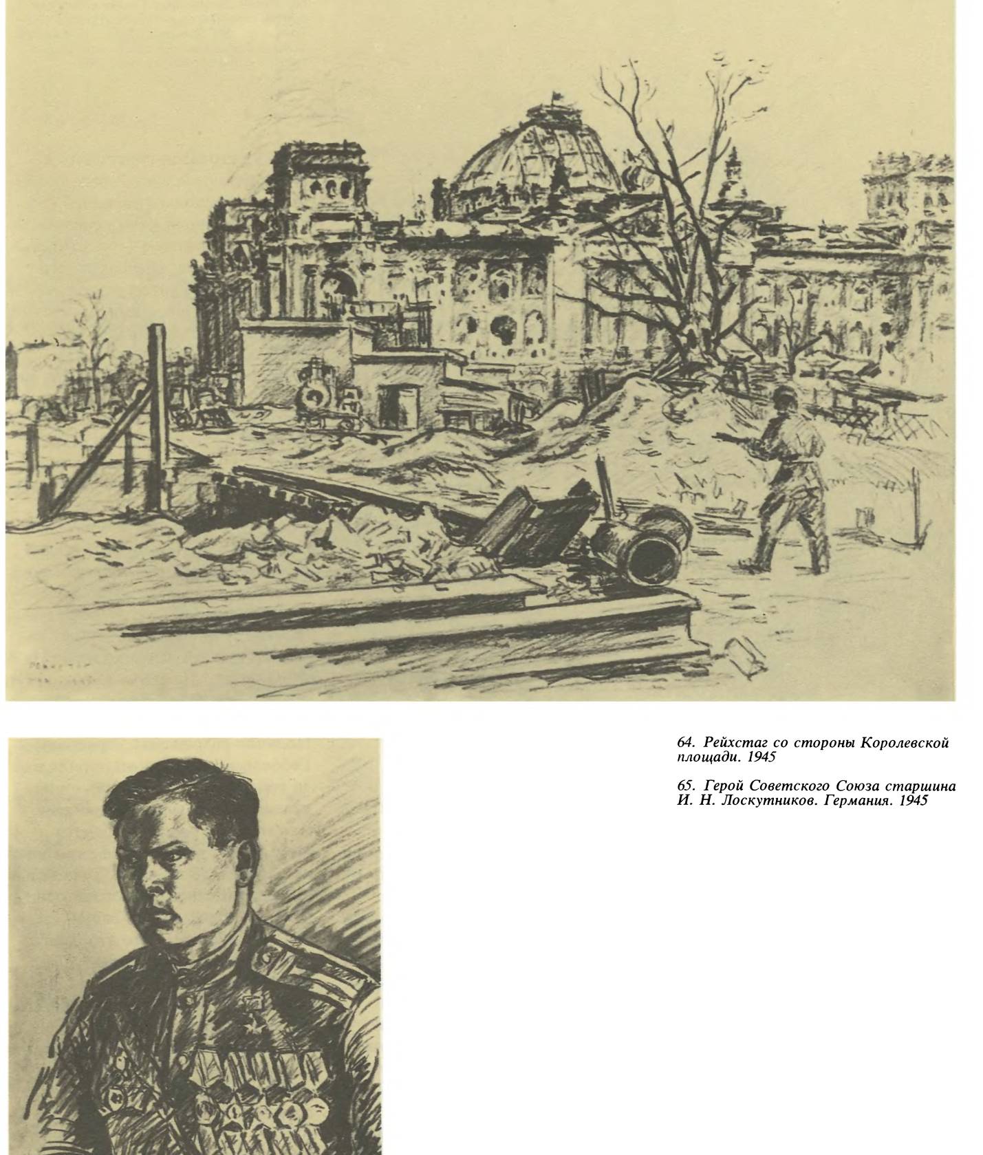 Надо было срочно приниматься за работу. В полутемном коридоре беспрестанно сновали люди, и, чтобы нам никто не мешал, Сьянов распахнул дверь ближайшего помещения. В этой комнате рейхстага я и рисовал советского воина, который, пройдя тяжелейший путь Великой Отечественной войны, закончил его победителем.