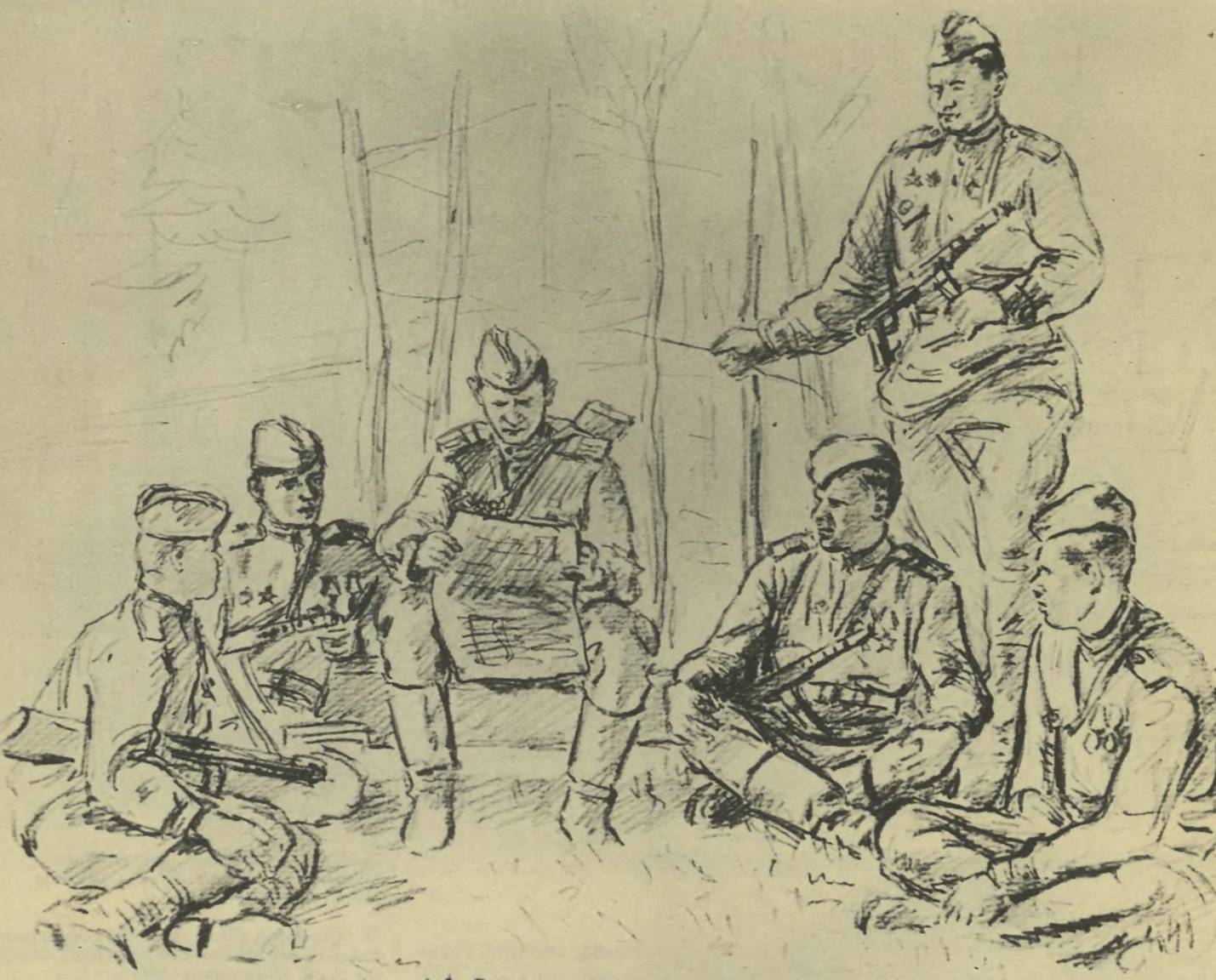 Вдруг какая-то тень легла на мой почти законченный рисунок. Я обернулся—за спиной у меня стоял полковник Зинченко в сопровождении связного. Оба—в солдатских ватниках. За эти дни нам приходилось неоднократно видеться и разговаривать. Очень хотелось сделать его портрет и именно при свете лампы, как я его впервые увидел в рейхстаге. Позже я так и нарисовал его.