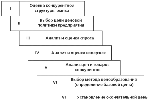 Таким образом, процесс ценообразования выступает как составная часть ценовой политики предприятия и представляет собой довольно-таки сложное действие, зависящее от множества как внутренних, так и внешних факторов, которые надо учитывать. Традиционно в экономической литературе выделяют следующие этапы этого процесса (рис. 12).