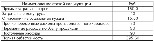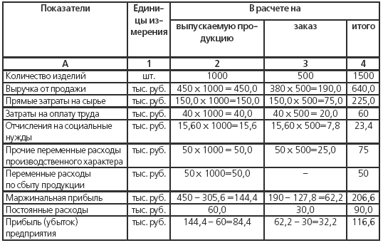 Пример 2. Предприятие производит 1500 изделий в месяц, реализуя их по цене 450 руб. за единицу. Данные о себестоимости представлены в табл. 5.8. Мощности позволяют выпускать 2000 изделий. Предприятие получило предложение от фирмы на выпуск 500 изделий по цене 380 руб. на условиях долгосрочного контракта. Имеет ли смысл принимать заказ и как это отразится на выручке и прибыли предприятия?
