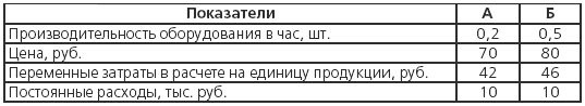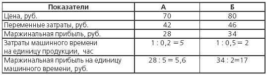 Пример 3. Предприятию необходимо принять решение, выпускать товар А или Б, так как у него ограничены возможности 3000 машиночасов в неделю. Данные о производстве представлены в табл. 5.10. Определите, какое изделие выгоднее производить, составив сравнительную калькуляцию (табл. 5.11) и рассчитав экономические показатели (табл. 5.12).