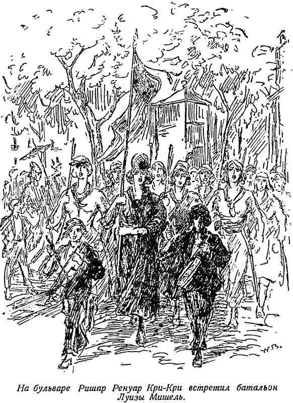На бульваре Ришар Ренуар Кри-Кри встретил батальон Луизы Мишель [17] , состоящий из ста двадцати женщин. Они шли живописной колонной, перекинув ружья через плечо, мерно отбивая шаг под бой двух малолетних барабанщиков.