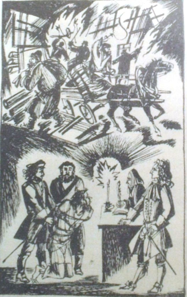 ...Темная ночь опустилась на подворье Филатьева. Затихли песни и смешки в девичьей половине людской. Не слышно позвякивания цепи со двора, — это угомонился медведь, прикованный к столбу на потеху хозяину. Чутко прислушиваясь, поднял свою лохматую голову Иван: вроде все спят. Скользнул к двери, ведущей в господский дом. У входа в спальню затаился, различая могучий храп хозяина и заливистый — хозяйки. Прокрался к заветному сундучку, на миг напрягся, нажимая железкой на поддавшееся ушко замка, бесшумно открыл крышку. Вот он, пухлый кошель. Недолго раздумывая, захватил и праздничные камзол и кафтан господина и, так же крадучись, выскользнул из дома, отодвинув доску забора, на улицу. Здесь напялил на себя господскую одежду и важно подплыл к воротам, от которых тотчас испуганно метнулась тень.