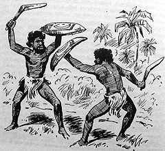 Первоначально, все австралийцы казались Томеку похожими друг на друга, как две капли воды. Их землисто-черные тела, покрывали широкие шрамы примитивной татуировки. Они были размалеваны белыми полосами в знак готовности к борьбе и охоте. У них были почти одинаковые и несколько удлиненные головы, покрытые черными, блестящими, густыми волосами, узкие у основания носы, широкие ноздри, маленькие глаза и толстые губы. Вся одежда туземцев состояла из связок сухой травы на шнурках, которыми повязаны бедра. Охотники были вооружены длинными копьями, бумерангами и щитами. Выглядели они воинственно и дико, несмотря на дружелюбные улыбки, появлявшиеся на их лицах при встрече с белыми.