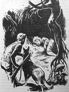 Остановился перед рощей. Через некоторое время собака выбежала из чащи. Жалобно скуля, она терлась о ноги мальчика, несколько раз бросалась в чащу, потом возвращалась, как бы приглашая его идти за собой.