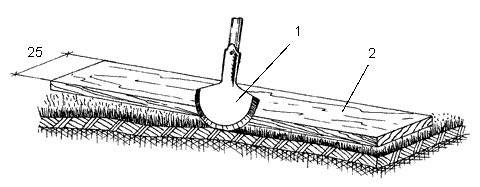 Рис. 29. Обрезка и выравнивание краев газона: 1 – лопата-секач; 2 – доска длиной 100–150 см и шириной 25 см