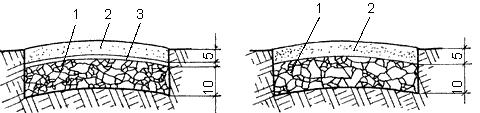 Рис. 32. Виды дорожек: а) дорожка из щебня и строительных отходов: 1 – основание – бой кирпича, доломит, крупная галька и пр.; 2 – покрытие – щебенка, шлак с крупнозернистым песком, мелкий доломит; 3 – подслой – жирная глина слоем 1–2 см; б) дорожка из шлака: 1 – основание – крупный шлак; 2 – покрытие – мелкий шлак с крупнозернистым песком, утрамбованный грунт