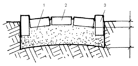 Рис. 33. Профиль дорожки из кирпича: 1 – крупнозернистый песок; 2 – красный кирпич, уложенный плашмя; 3 – бордюр из кирпича, уложенного на ребро